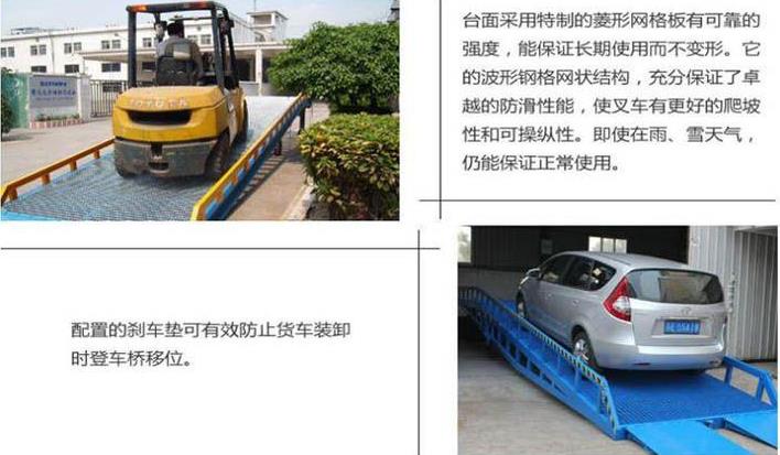 移動(dòng)式液登車橋是與叉車配合使用的貨物裝卸輔助設(shè)備。移動(dòng)式液登車橋是與叉車配合使用的貨物裝卸輔助設(shè)備。采用人工液壓動(dòng)力,勿須外接動(dòng)力電源即可輕松實(shí)現(xiàn)登車橋的高度調(diào)節(jié)??烧{(diào)節(jié)長度的索鏈用于鉤住車輛,使登車橋與車輛即使發(fā)生移位時(shí),始終緊密貼合。移動(dòng)輪采用實(shí)心輪胎,不用充氣,堅(jiān)固,配合剎車墊,保證作業(yè)安全。